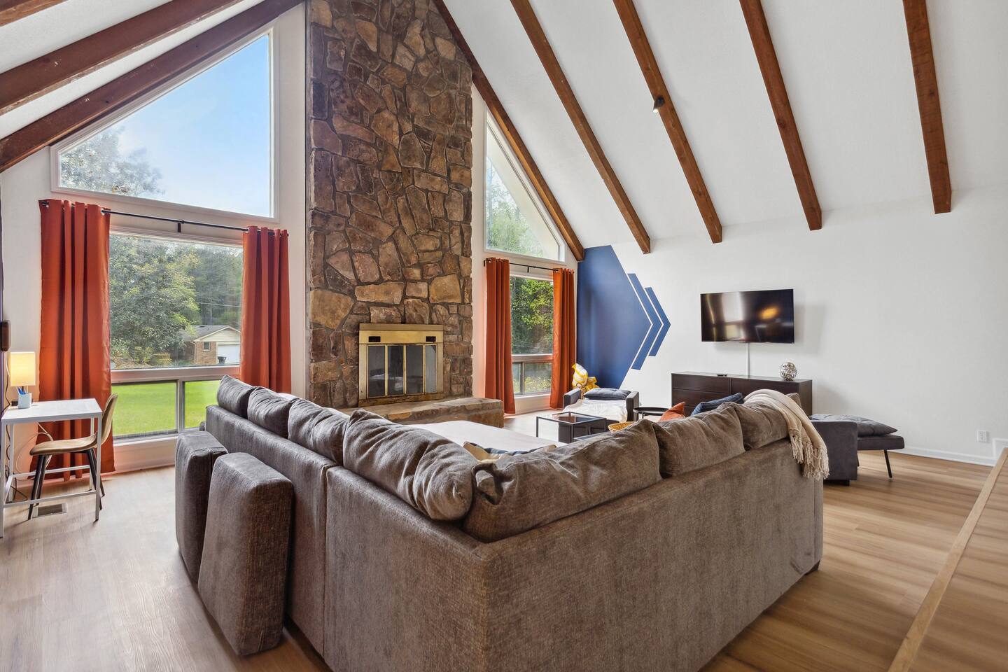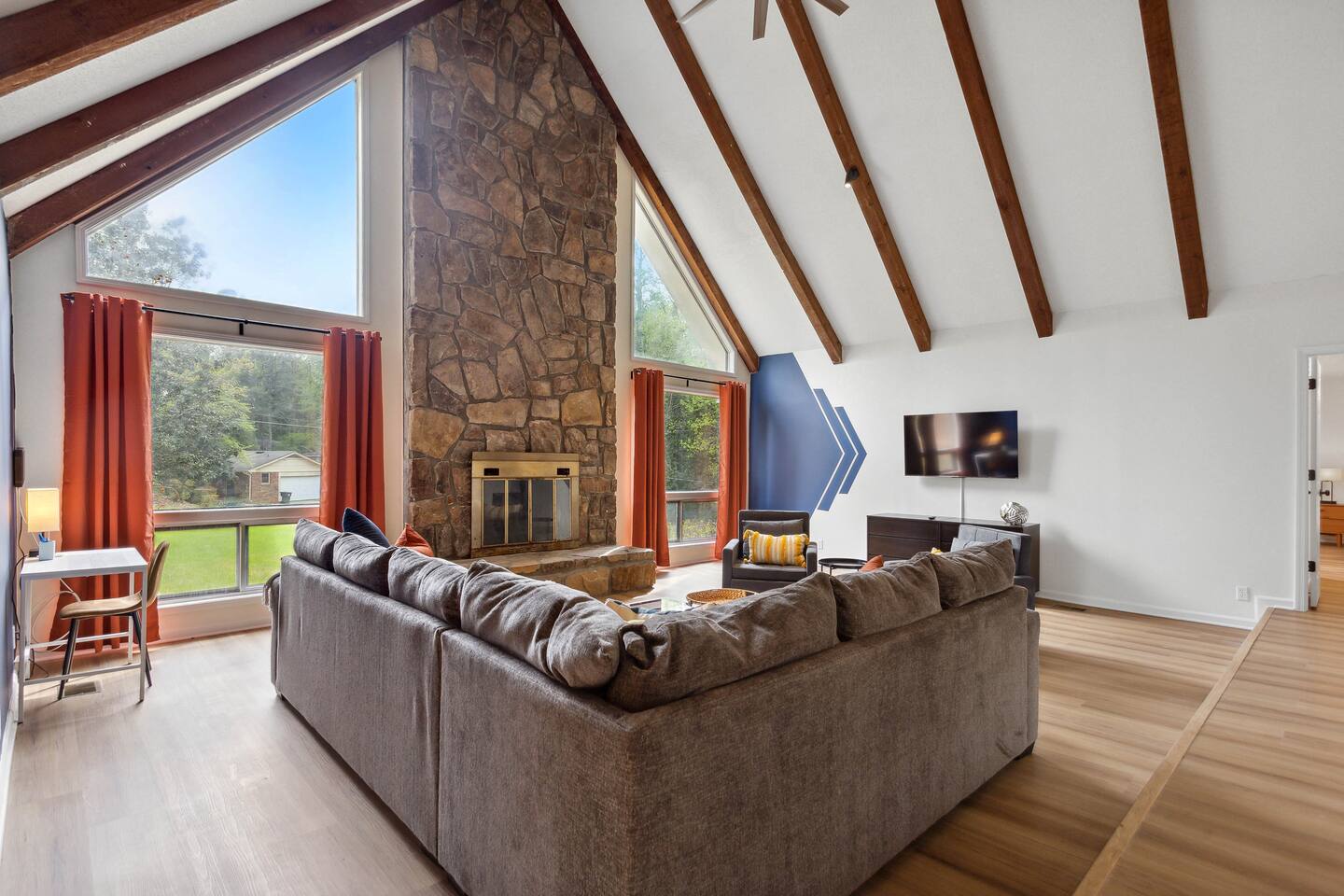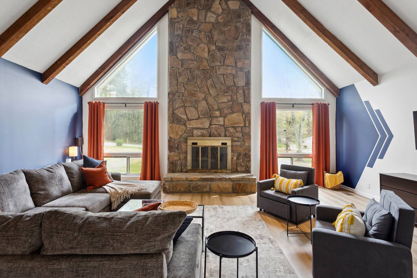 Your perfect getaway in our spacious family home, designed for comfort and relaxation! With a big living area with tall windows, a cozy fireplace, and vaulted ceilings, it's ideal for gathering with friends or family. This home’s versatile layout sleeps up to 10 guests and includes a full kitchen with seating for 16. Enjoy private moments on the expansive deck or unwind in any room with a 55” 4K HD Smart TV. Whether for fun or relaxation, this home has everything you need for a memorable stay.