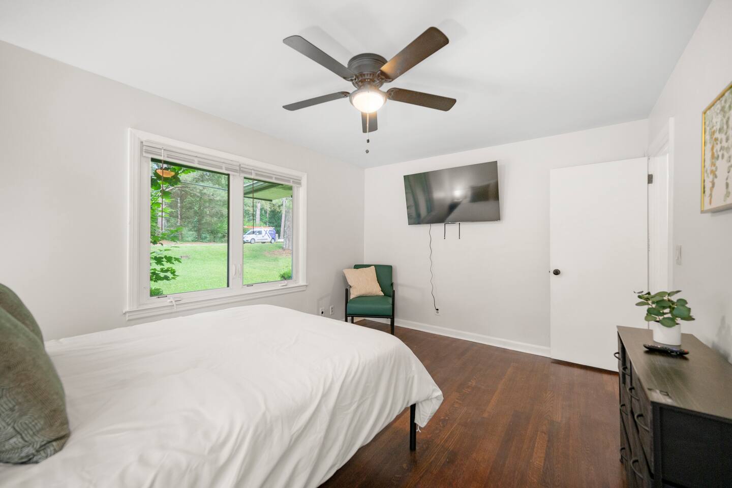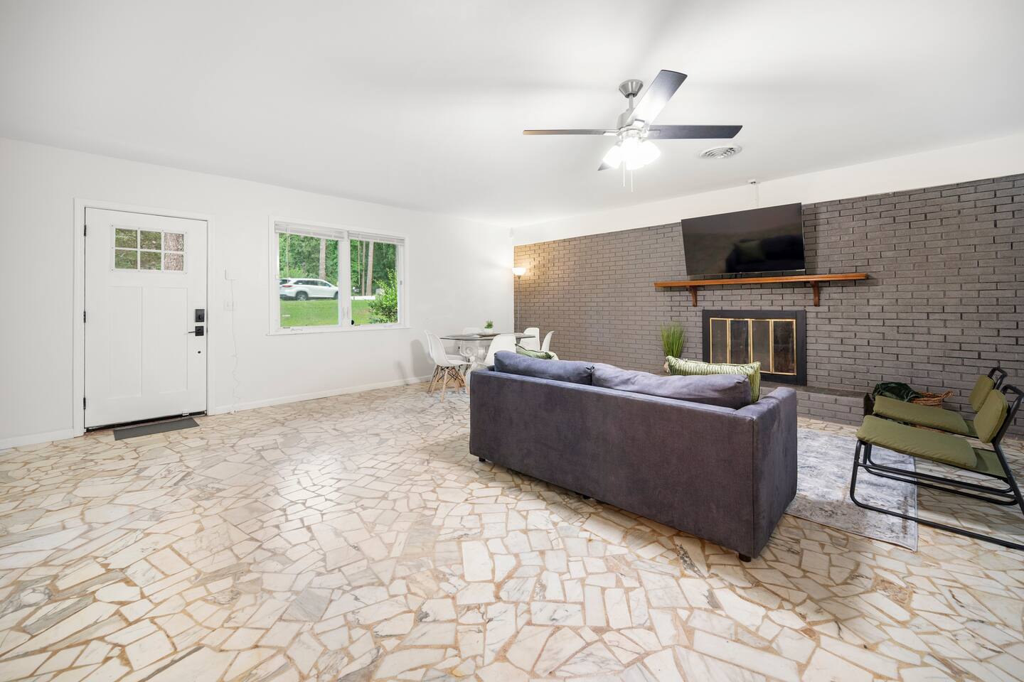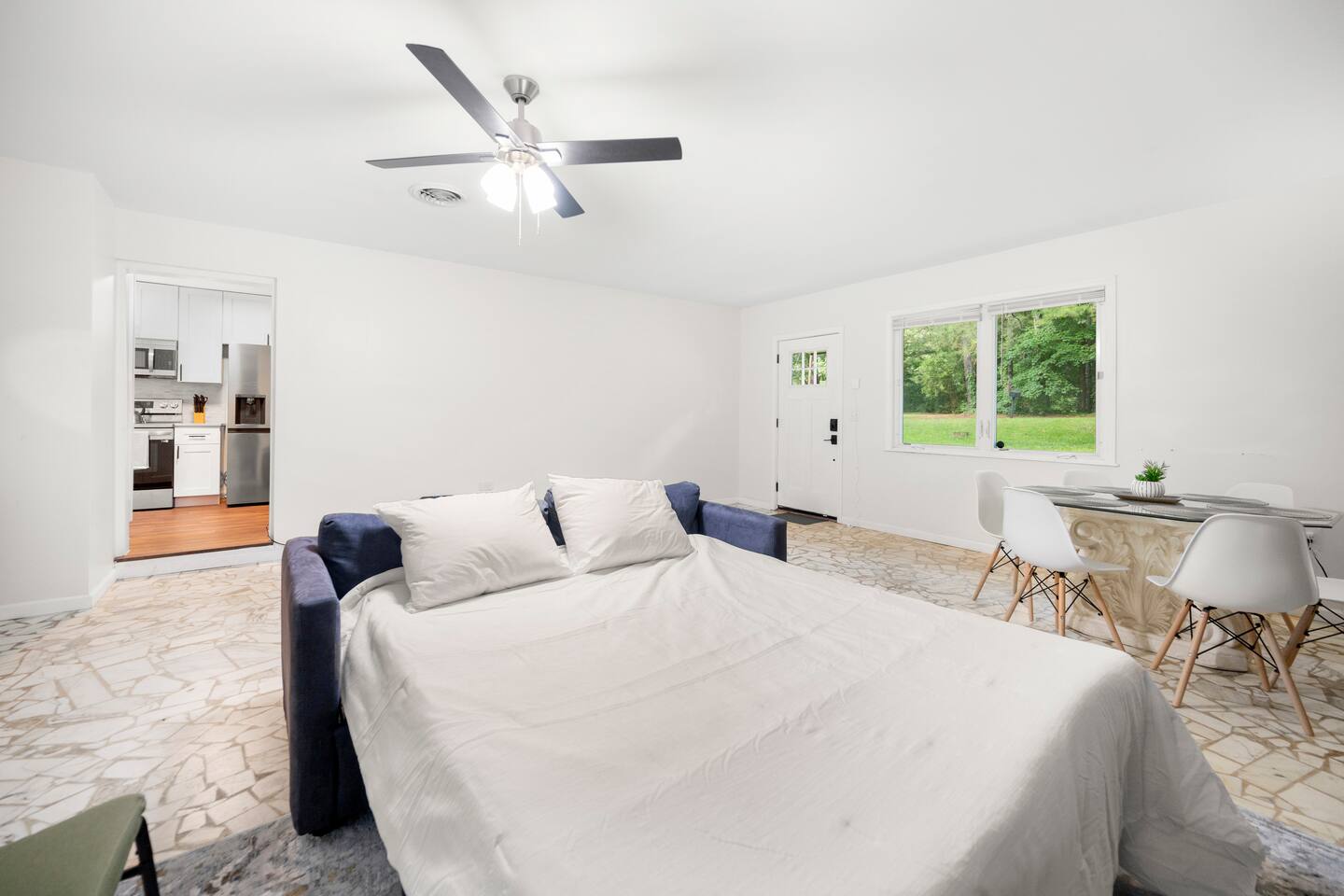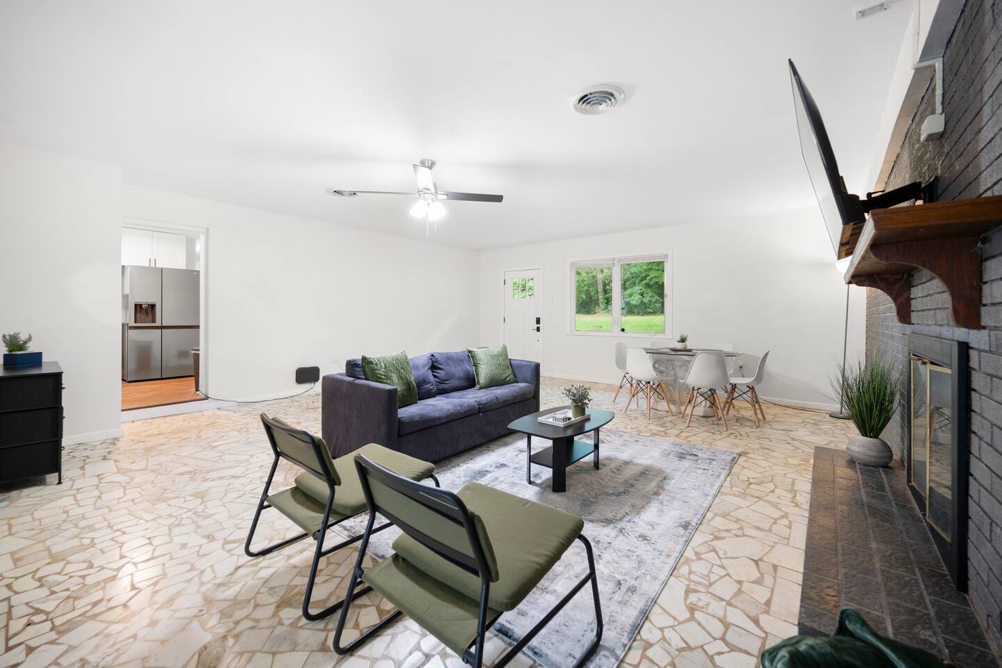 Our newly renovated family home is the perfect place to relax and unwind after a long day of exploring. The spacious fenced-in backyard is perfect for your dogs to run and play. The home is also equipped with all the amenities you need for a comfortable stay, including brand-new appliances, a fully stocked kitchen, and a comfortable living room with a Roku smart TV.