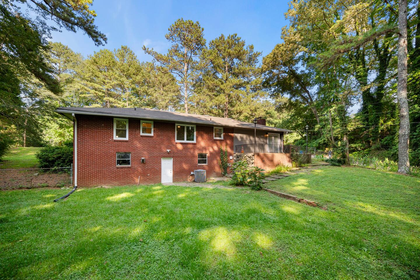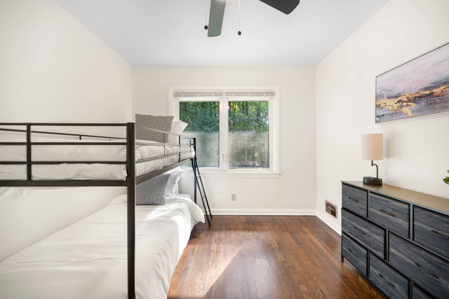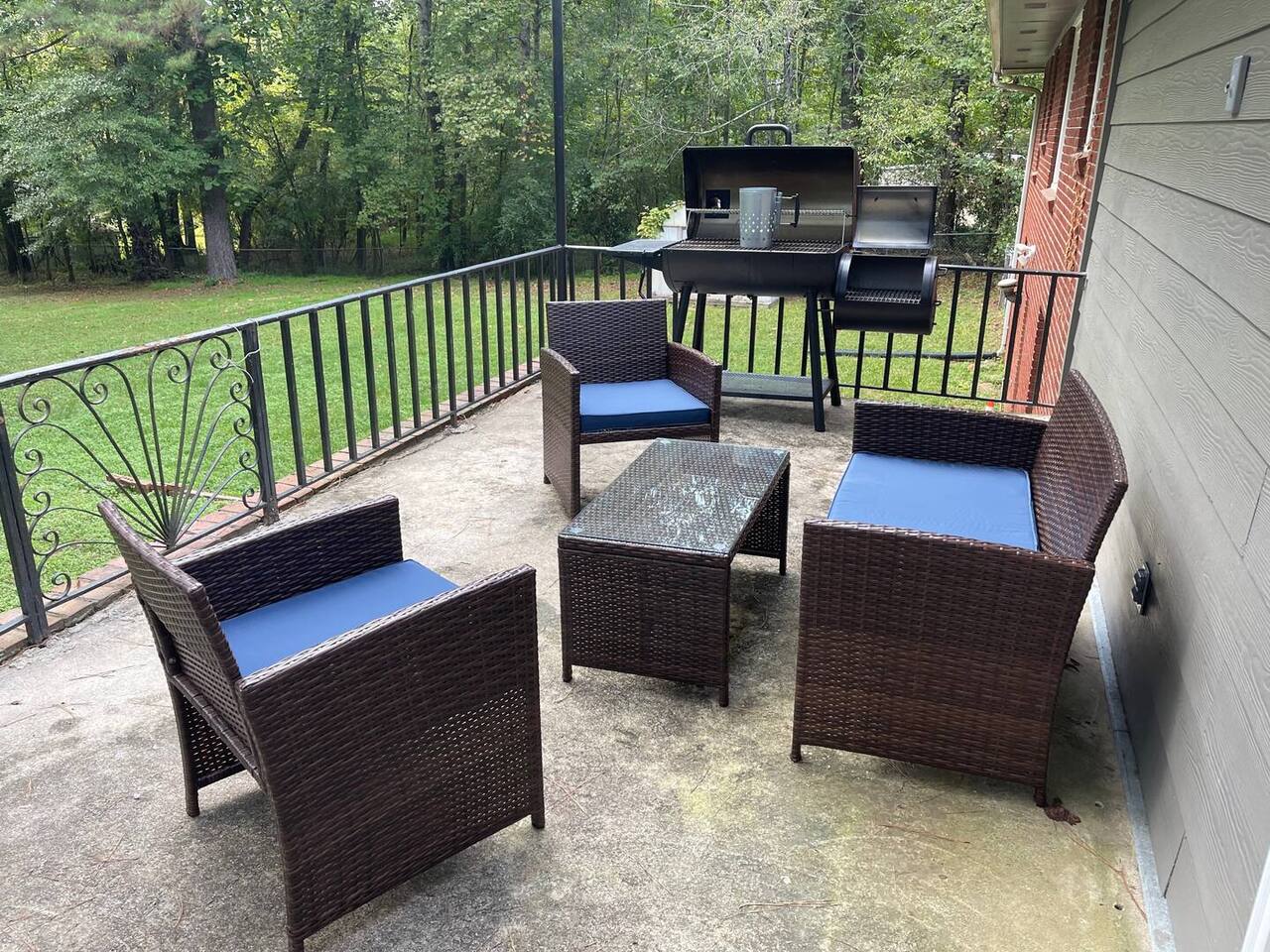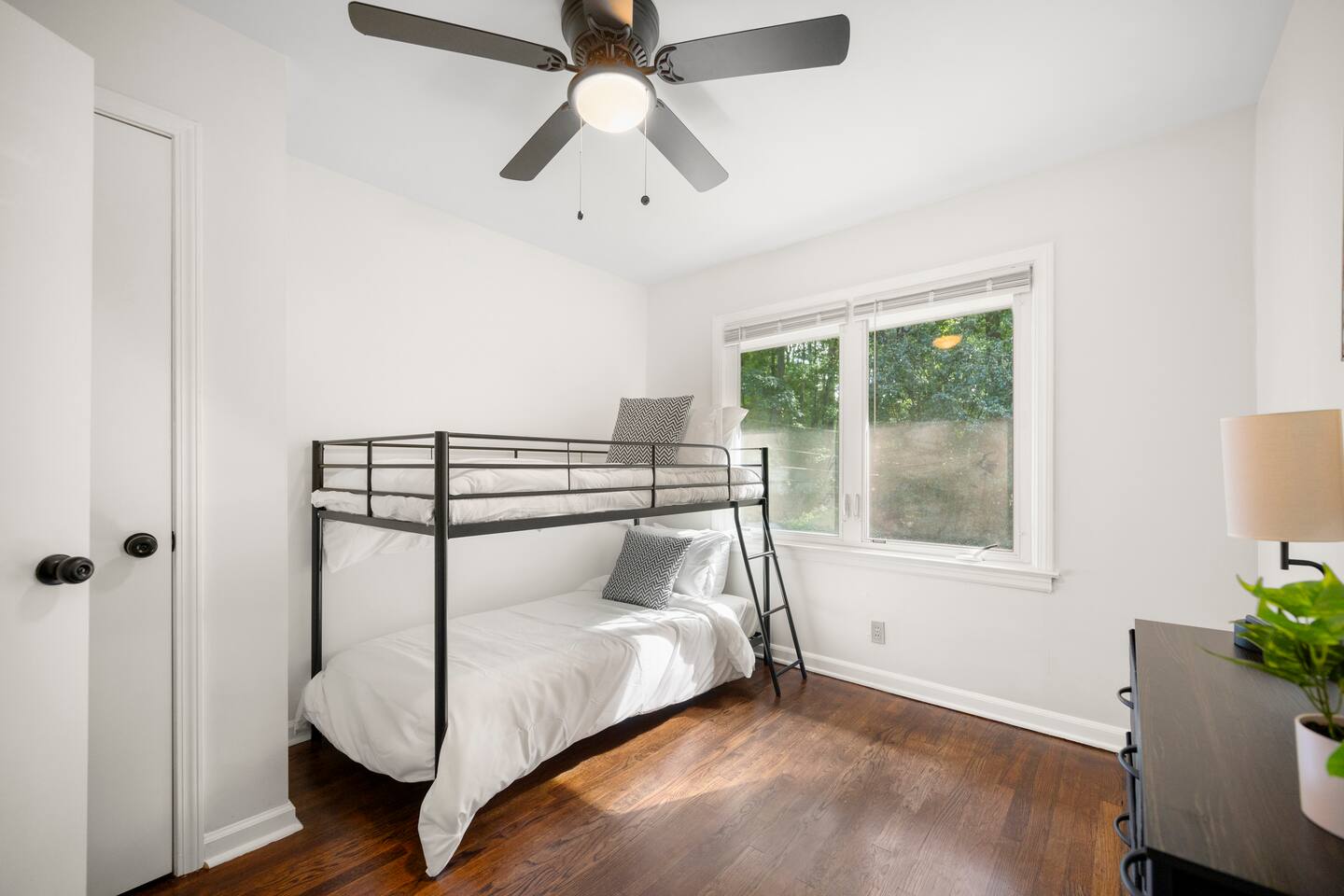 Patio: Outdoor furniture with seating for 2, BBQ grill, wide nature view, and easy access. Kitchen: Fully equipped with a big fridge, oven, stove, microwave, dishwasher, cabinets, drawers, pots, pans, utensils, and a sink. Stocked with cooking and baking essentials, coffee, tea, and basic spices. Dining Area: Wide window for natural light, dining table with seating for 6. Bedroom 1: Queen bed, drawers, bedside table with lamp, ceiling fan, and a window. Bedroom 2: Queen bed, ceiling fan, bedside table with lamp, and clothing storage. Bedroom 3: Double bed, ceiling fan, windows, drawers, bedside table with lamp, and Smart TV. Bedroom 4: Bunk bed, ceiling fan, drawers, lamp, and windows. Full Bathroom 1: Toilet, dressing sink with mirror, and shower. Full Bathroom 2: Toilet, sink with mirror, and bathtub. Dedicated Workspace: Office/study desk, 2 desk lamps, board, 2 chairs, and a mini shelf. Backyard: Deck with outdoor furniture and a spacious grassy yard. Laundry Area: Washer, dryer, and detergent provided.