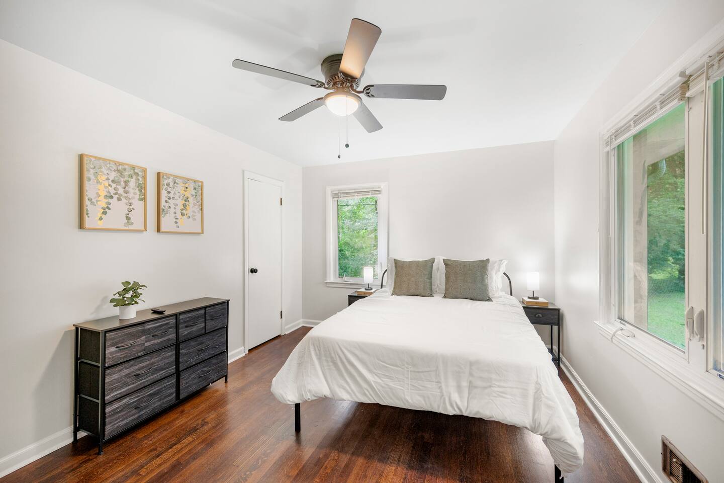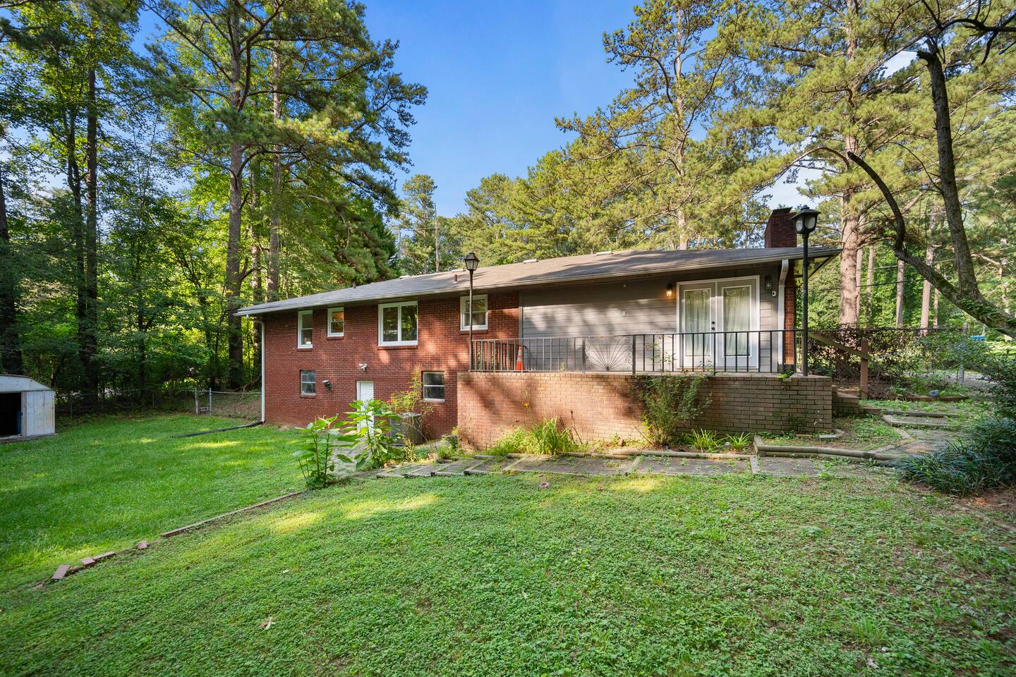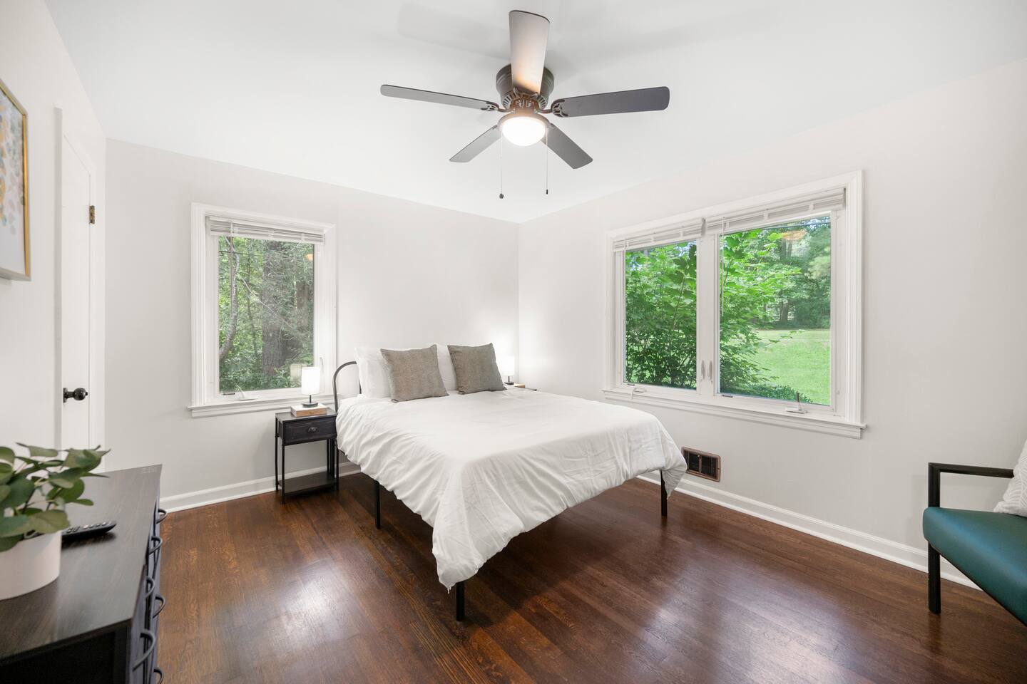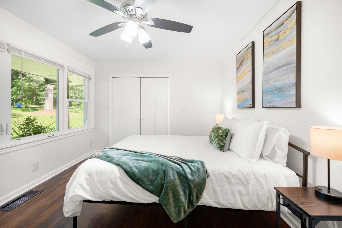Patio: Outdoor furniture with seating for 2, BBQ grill, wide nature view, and easy access. Kitchen: Fully equipped with a big fridge, oven, stove, microwave, dishwasher, cabinets, drawers, pots, pans, utensils, and a sink. Stocked with cooking and baking essentials, coffee, tea, and basic spices. Dining Area: Wide window for natural light, dining table with seating for 6. Bedroom 1: Queen bed, drawers, bedside table with lamp, ceiling fan, and a window. Bedroom 2: Queen bed, ceiling fan, bedside table with lamp, and clothing storage. Bedroom 3: Double bed, ceiling fan, windows, drawers, bedside table with lamp, and Smart TV. Bedroom 4: Bunk bed, ceiling fan, drawers, lamp, and windows. Full Bathroom 1: Toilet, dressing sink with mirror, and shower. Full Bathroom 2: Toilet, sink with mirror, and bathtub. Dedicated Workspace: Office/study desk, 2 desk lamps, board, 2 chairs, and a mini shelf. Backyard: Deck with outdoor furniture and a spacious grassy yard. Laundry Area: Washer, dryer, and detergent provided.