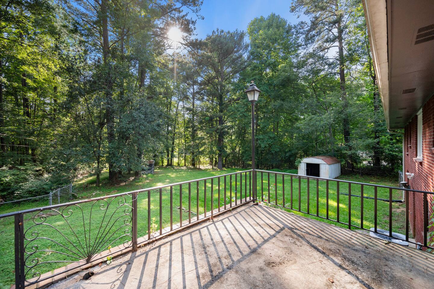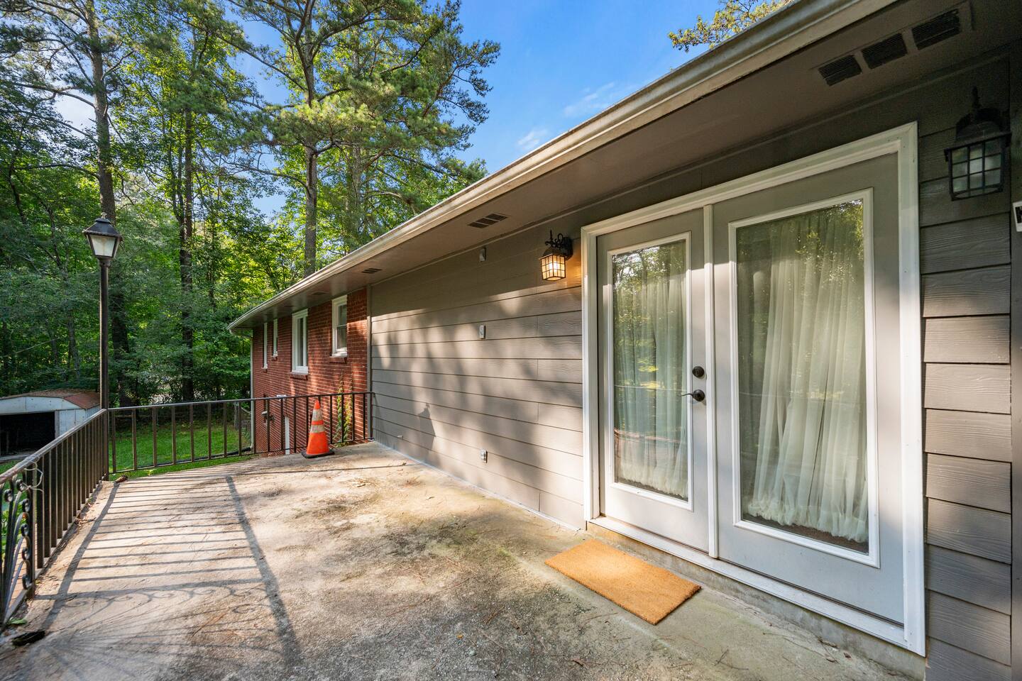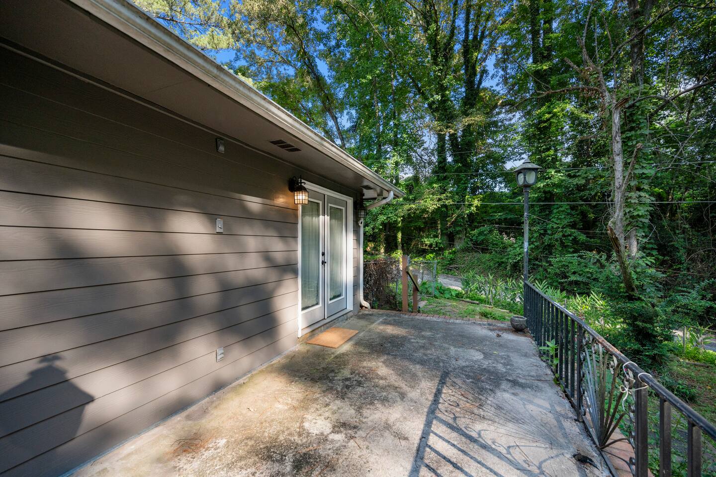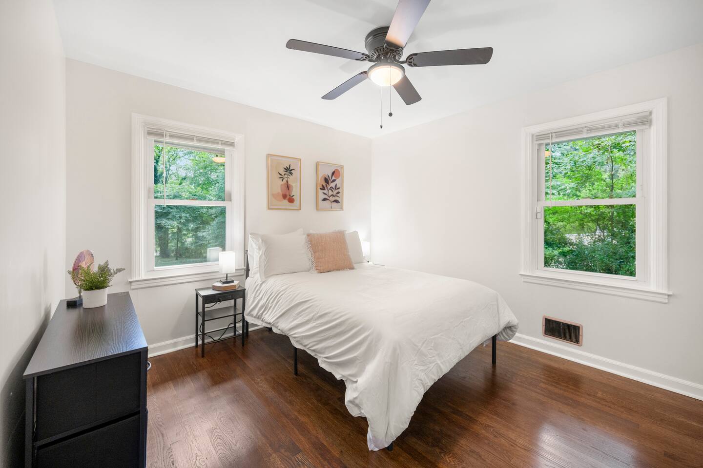 Patio: Outdoor furniture with seating for 2, BBQ grill, wide nature view, and easy access. Kitchen: Fully equipped with a big fridge, oven, stove, microwave, dishwasher, cabinets, drawers, pots, pans, utensils, and a sink. Stocked with cooking and baking essentials, coffee, tea, and basic spices. Dining Area: Wide window for natural light, dining table with seating for 6. Bedroom 1: Queen bed, drawers, bedside table with lamp, ceiling fan, and a window. Bedroom 2: Queen bed, ceiling fan, bedside table with lamp, and clothing storage. Bedroom 3: Double bed, ceiling fan, windows, drawers, bedside table with lamp, and Smart TV. Bedroom 4: Bunk bed, ceiling fan, drawers, lamp, and windows. Full Bathroom 1: Toilet, dressing sink with mirror, and shower. Full Bathroom 2: Toilet, sink with mirror, and bathtub. Dedicated Workspace: Office/study desk, 2 desk lamps, board, 2 chairs, and a mini shelf. Backyard: Deck with outdoor furniture and a spacious grassy yard. Laundry Area: Washer, dryer, and detergent provided.