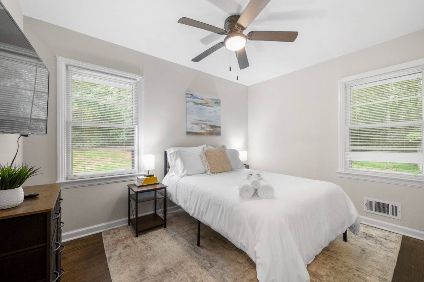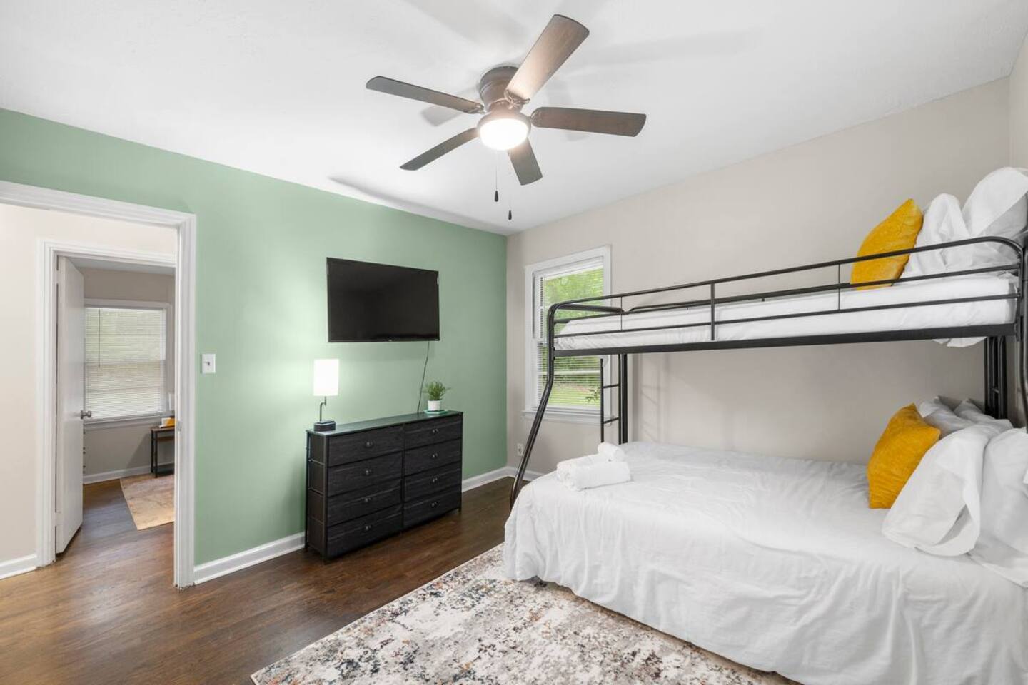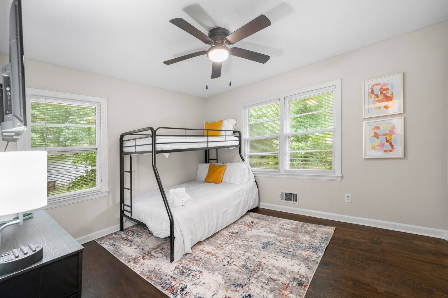 Key Features and Amenities General Features: - Convenient keyless entry - Professionally cleaned and sanitized between each guest - Super-fast dedicated WiFi - Basic toiletries provided Living Area: - Spacious and airy atmosphere, perfect for families or groups of friends - Queen-size sleeper sofa - 55” UHD 4K Roku TV - Dining table that seats six guests - Working desk with lamp and chair - Air conditioning and heating - Ceiling fan Kitchen: - Fully equipped with cooking and baking essentials: pots, pans, utensils, mixing bowls, etc. - Coffee, tea, and basic spices provided - Second dining table seating four - Appliances: fridge, oven, stove, dishwasher, microwave, toaster, blender, coffee maker, hot water kettle - Big cabinets and drawers for storage - Dishes, silverware, and cooking basics provided Dining Area: - Dining table with seating for six Bedrooms: - Bedroom 1: Queen bed, air conditioning, heating, ceiling fan, bed linens, clothing storage, extra pillows and blankets, hangers, iron, pack 'n play/travel crib - Bedroom 2: Double bed, air conditioning, heating, bed linens, clothing storage, extra pillows and blankets, hangers, iron, - Bedroom 3: Bunk bed (full/twin), air conditioning, heating, ceiling fan, bed linens, clothing storage, extra pillows and blankets, hangers, iron, pack 'n play/travel crib Bathrooms: - Full Bathroom 1 & 2: - Air conditioning - Bathtub - Body soap - Shampoo and conditioner - Hair dryer - Heating - Hot water - Cleaning products Backyard: - Spacious grassy and concrete areas - Outdoor table with seats - Parking for three vehicles - Fenced yard with a large grassy area Laundry: - In-unit washer and dryer - Laundry pods provided This lovely home offers a spacious and comfortable environment with all the amenities you need for a relaxing stay. Perfect for families or groups, it is the ideal spot to experience the best that Airbnb has to offer!