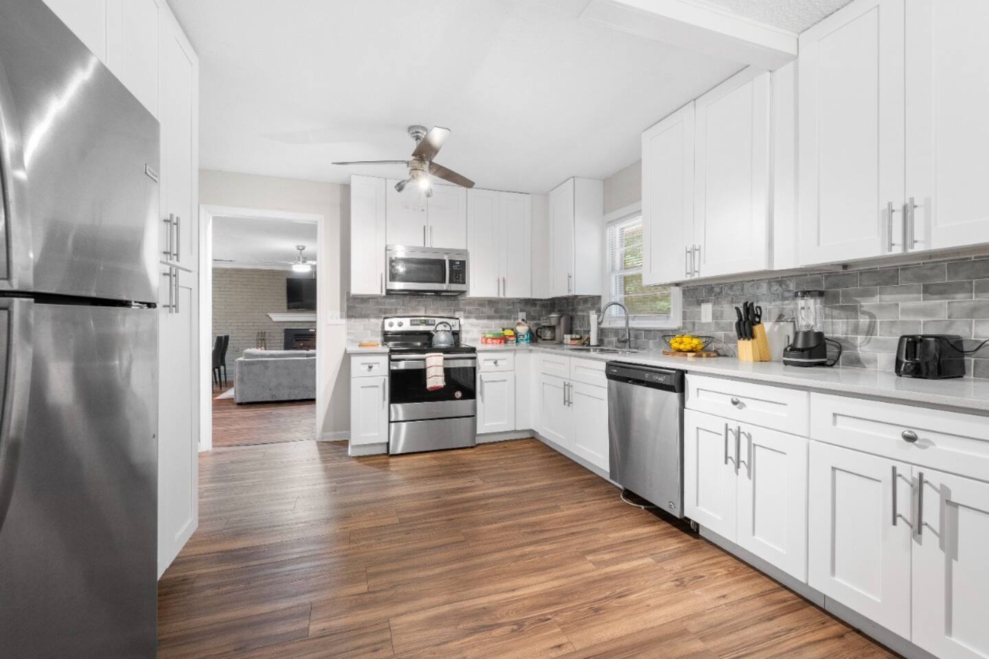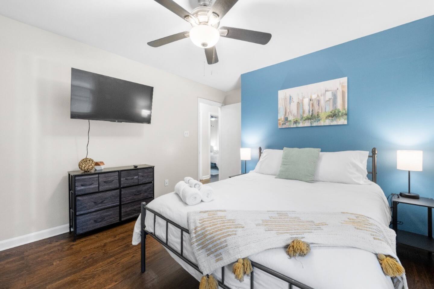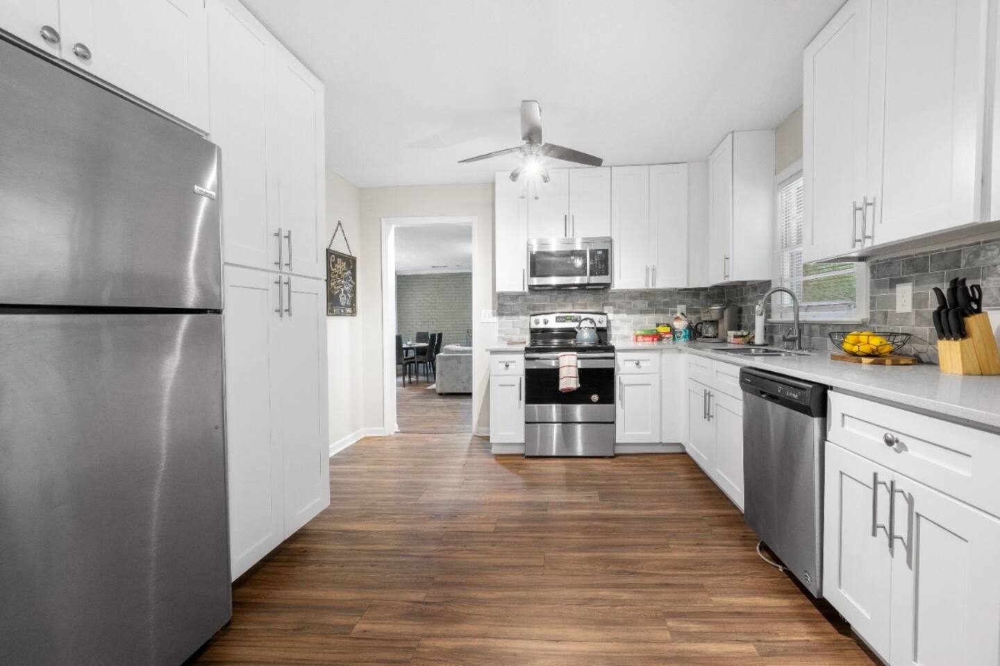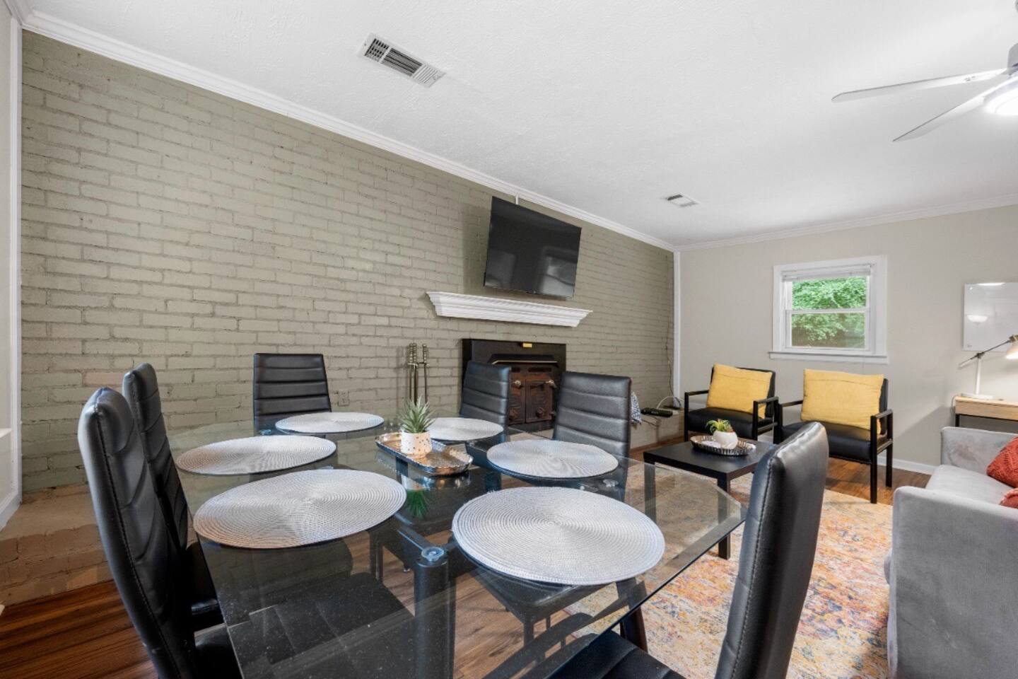 Key Features and Amenities General Features: - Convenient keyless entry - Professionally cleaned and sanitized between each guest - Super-fast dedicated WiFi - Basic toiletries provided Living Area: - Spacious and airy atmosphere, perfect for families or groups of friends - Queen-size sleeper sofa - 55” UHD 4K Roku TV - Dining table that seats six guests - Working desk with lamp and chair - Air conditioning and heating - Ceiling fan Kitchen: - Fully equipped with cooking and baking essentials: pots, pans, utensils, mixing bowls, etc. - Coffee, tea, and basic spices provided - Second dining table seating four - Appliances: fridge, oven, stove, dishwasher, microwave, toaster, blender, coffee maker, hot water kettle - Big cabinets and drawers for storage - Dishes, silverware, and cooking basics provided Dining Area: - Dining table with seating for six Bedrooms: - Bedroom 1: Queen bed, air conditioning, heating, ceiling fan, bed linens, clothing storage, extra pillows and blankets, hangers, iron, pack 'n play/travel crib - Bedroom 2: Double bed, air conditioning, heating, bed linens, clothing storage, extra pillows and blankets, hangers, iron, - Bedroom 3: Bunk bed (full/twin), air conditioning, heating, ceiling fan, bed linens, clothing storage, extra pillows and blankets, hangers, iron, pack 'n play/travel crib Bathrooms: - Full Bathroom 1 & 2: - Air conditioning - Bathtub - Body soap - Shampoo and conditioner - Hair dryer - Heating - Hot water - Cleaning products Backyard: - Spacious grassy and concrete areas - Outdoor table with seats - Parking for three vehicles - Fenced yard with a large grassy area Laundry: - In-unit washer and dryer - Laundry pods provided This lovely home offers a spacious and comfortable environment with all the amenities you need for a relaxing stay. Perfect for families or groups, it is the ideal spot to experience the best that Airbnb has to offer!